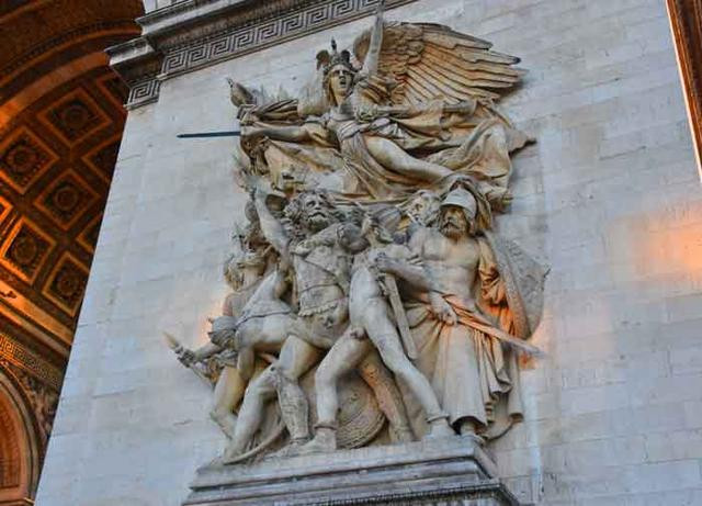 其中最著名也是最精美的的一幅就是位于面向香榭丽舍大街一面右下侧的那幅浮雕,上面描绘了1792年义勇军出征的情景,这一名作取名《马赛曲》。拿破仑大捷庆祝仪式的场面则被刻在这幅浮雕上方的其他位置,在顶端的盾形饰物上刻有每场战役的名称。