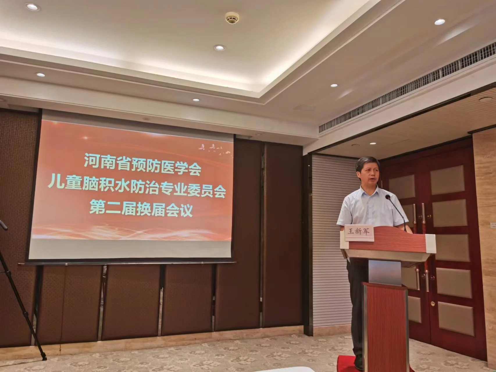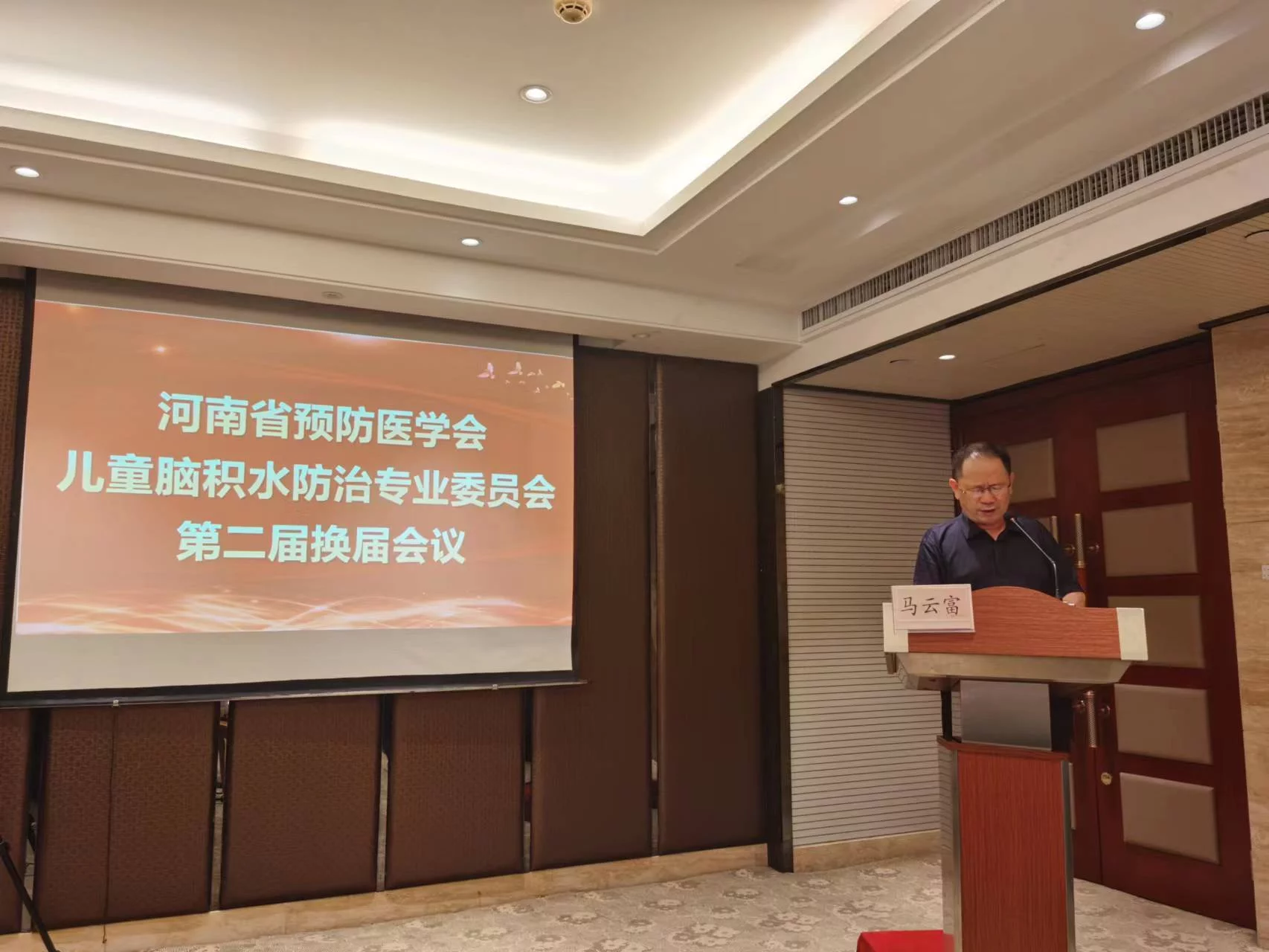 河南省卫生健康委副主任、河南省疾控中心党委书记、河南省预防医学会副会长兼秘书长郭万申同志亲临会议现场并讲话,他首先向新当选的马云富主任委员和各位委员表示热烈地祝贺,希望在接下来的工作中新一届儿童脑积水防治专委会继承优良传统,携手各位委员再接再厉开展工作。