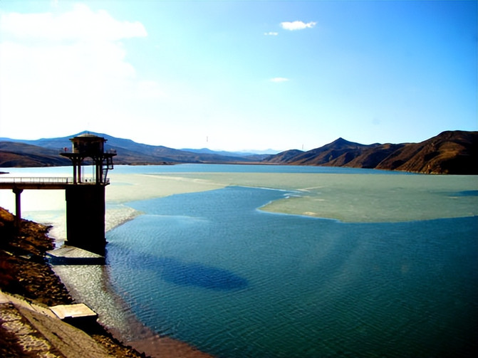 站在大坝上眺望,蓝天白云下的浩瀚碧蓝的水面一眼望不到边。也许是气温较低的原因,水面并没有完全融化,有的水域仍然结着冰,但丝毫不影响壮观的水库美景。