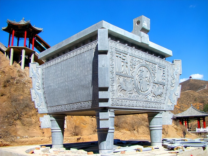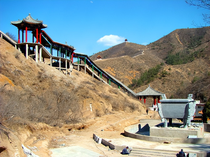 这里正在大兴土木,观景彩绘长廊蜿蜒曲折的顺山而建。走进景区首先看到的是一个刚建成的灰色大石鼎。